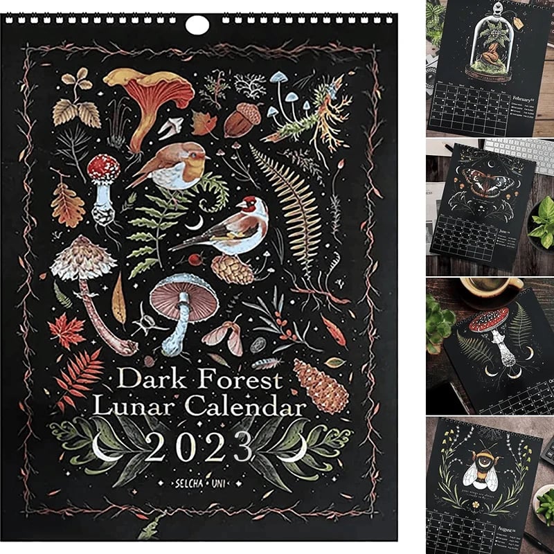 ✧Dark Forest Lunar Calendar 2023: Features 12 original illustrations that I have drawn throughout the year. Botanical motives, magical creatures and plants, forest, nature, wild life, the moon and stars and the power within us. The grid with all the information and icons was handmade.